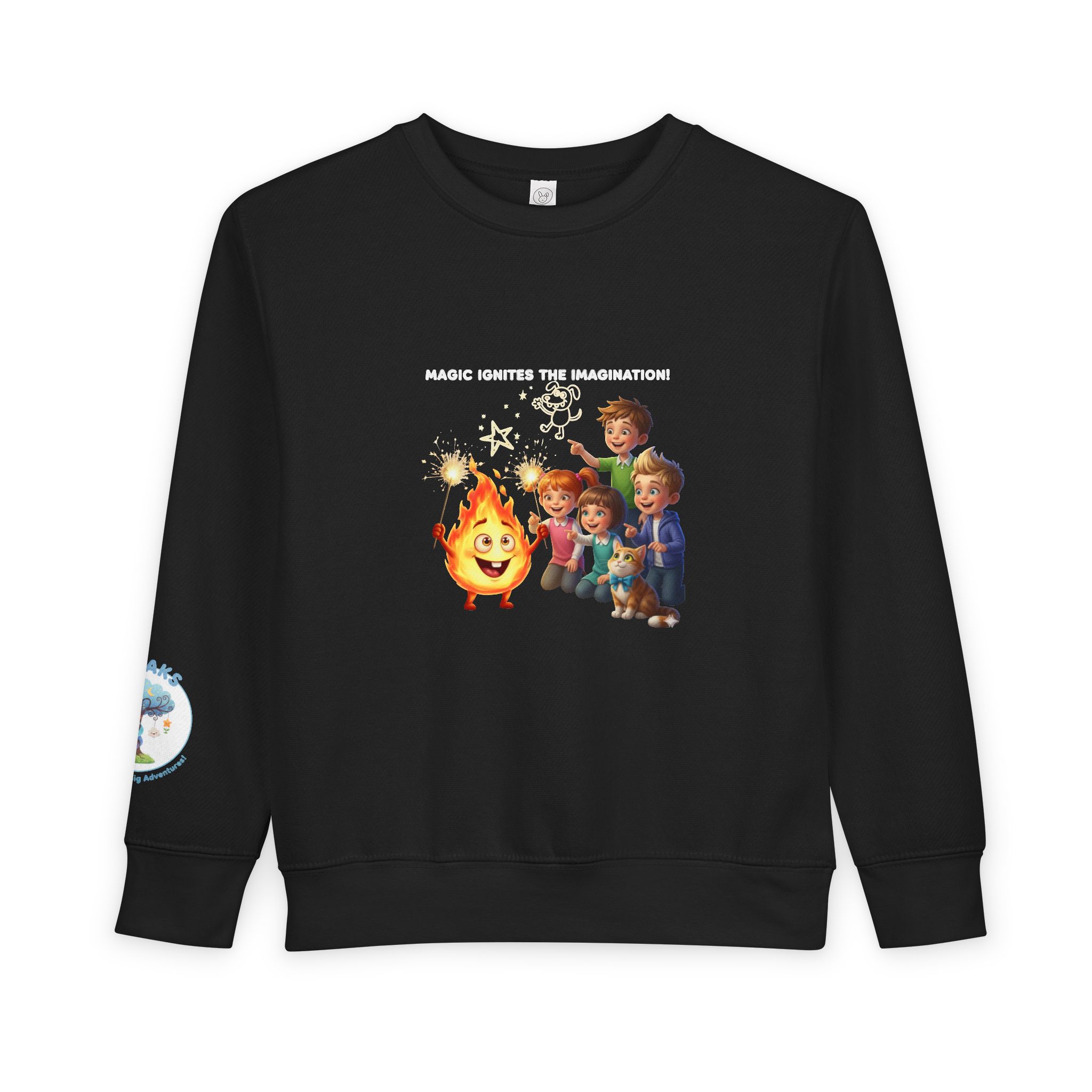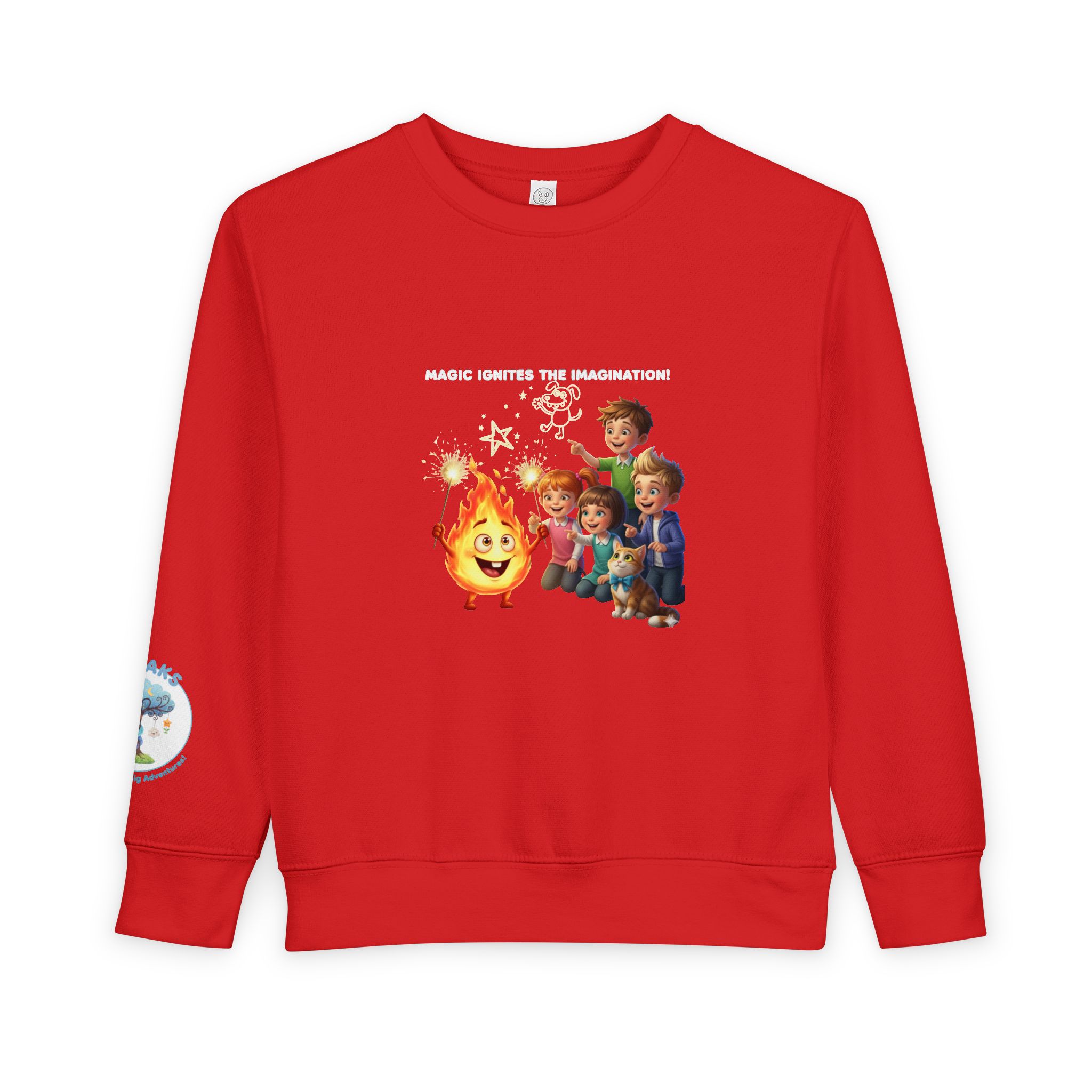 The design features a happy little flame holding two sparkly sparklers, surrounded by cheering children, a happy dog, and a handsome cat. This sweatshirt captures the magic of a festive night and the fun of making memories with friends. Ideal for chilly outings, playdates, or cozy family gatherings, this hoodie is a great addition to any kid’s wardrobe. It’s also a thoughtful gift for holidays like Christmas or Easter, sure to delight both kids and parents alike! Perfect for toddlers who enjoy a vibrant, cheerful style.