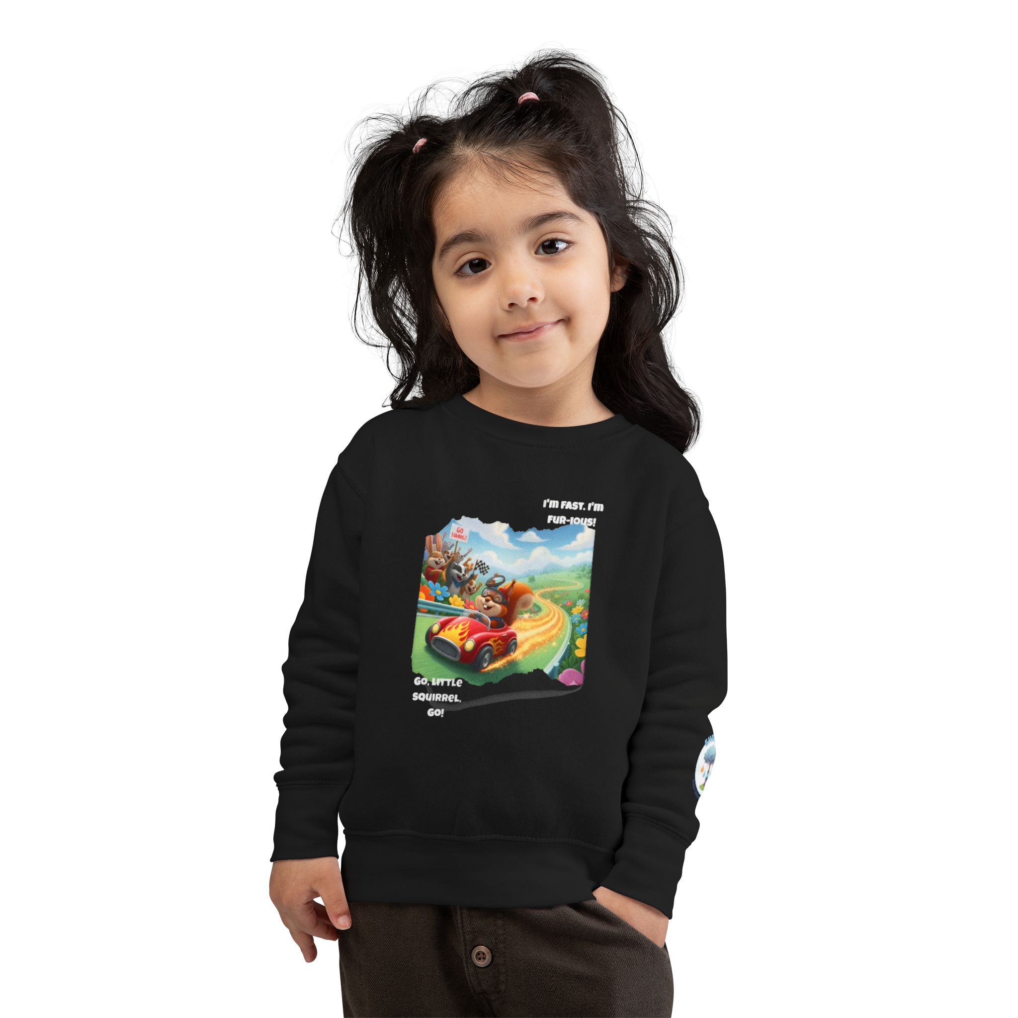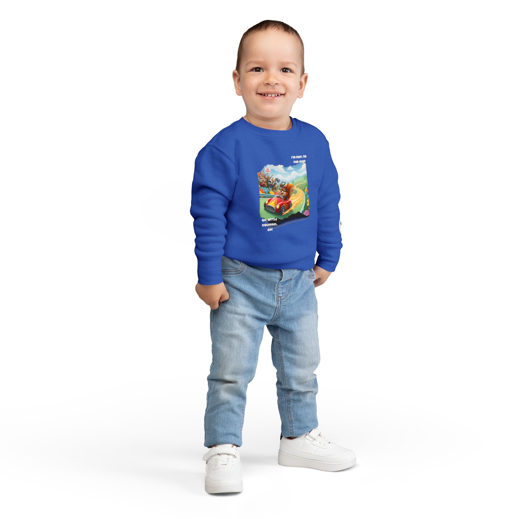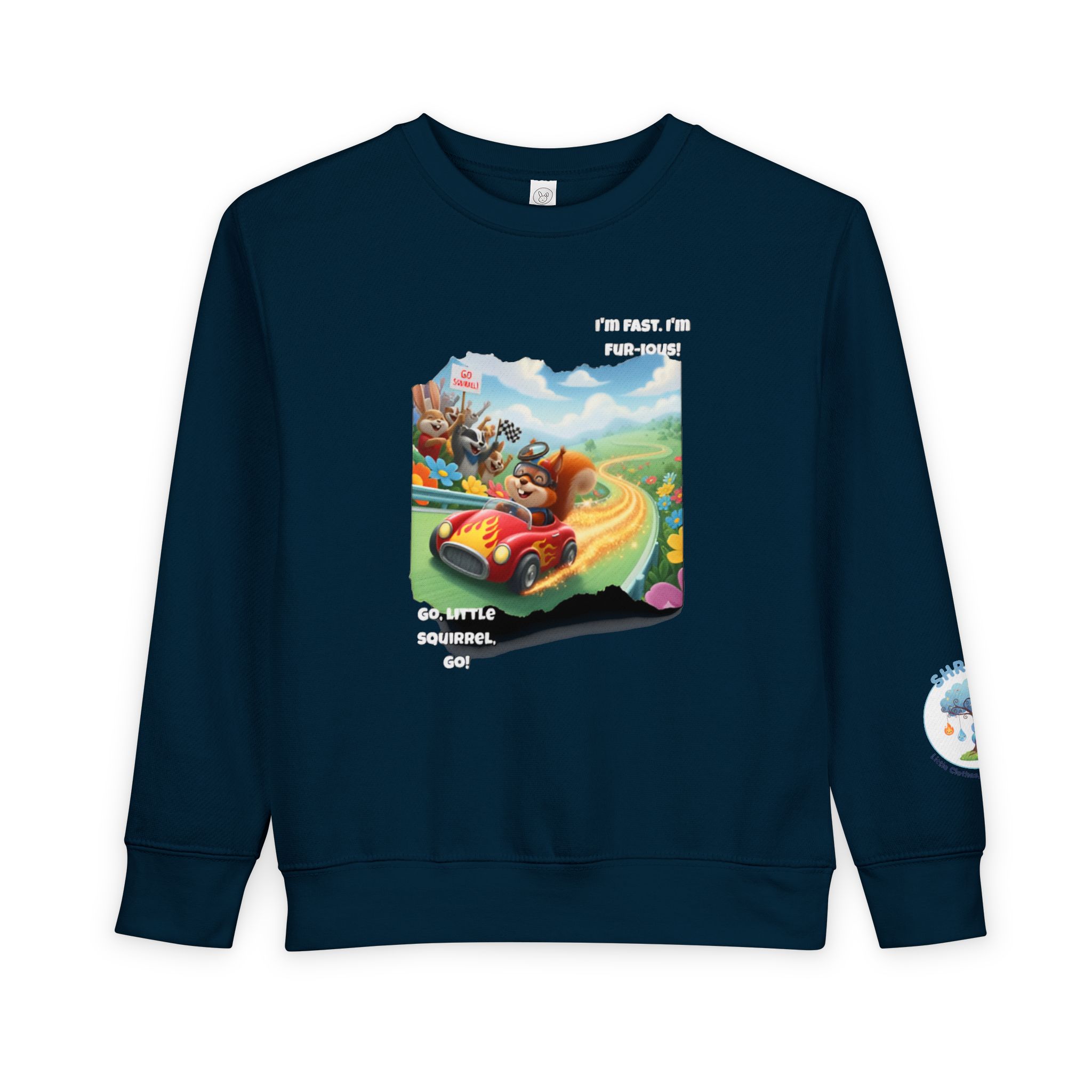 The design features a cheerful squirrel racing in a red, flame-covered car, leaving a magical, sparkling trail behind him. With his friends cheering from the sidelines, this sweatshirt captures the excitement of a fun race and the bold message of friendly competition and big dreams. Ideal for chilly outings, playdates, or cozy family gatherings, this top is a great addition to any kid’s wardrobe. It’s also a thoughtful gift for holidays like Christmas or Easter, sure to delight both kids and parents alike! Perfect for toddlers who enjoy a vibrant, cheerful style.